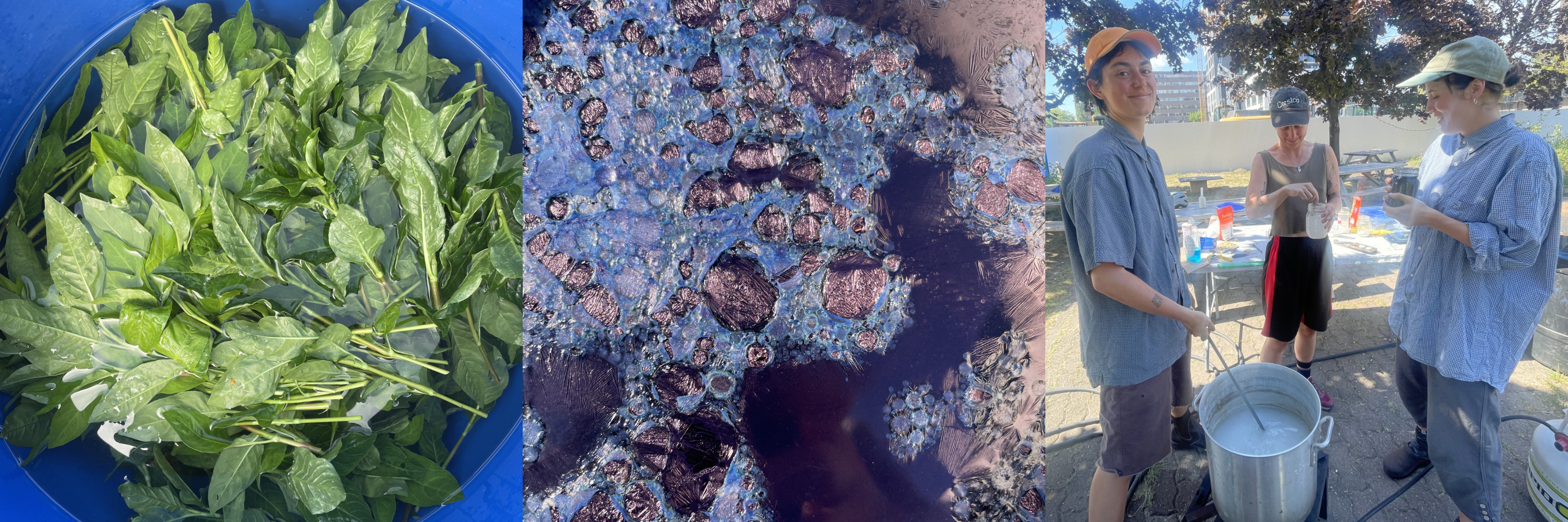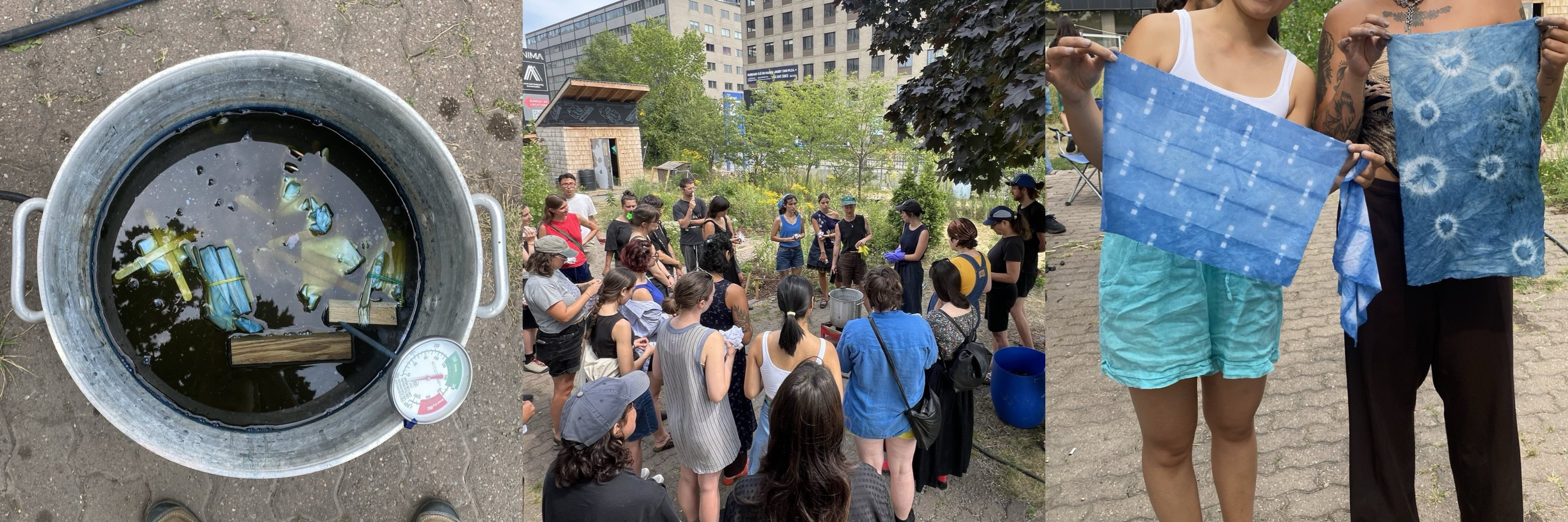To make the vat, we combined our pigment with fructose (a reducing agent) and more calcium hydroxide. Once the vat is ready fabric can be dyed in it. Indigo works best with protein fibres like silk, but cotton works good as well. It is a unique dye in that you do not need to mordant cotton beforehand, just scour it. We ran an indigo workshop at Dye Jardin Papillon (see below) explaining the whole process while also giving people the oppourtunity to learn some simple shibori techniques.